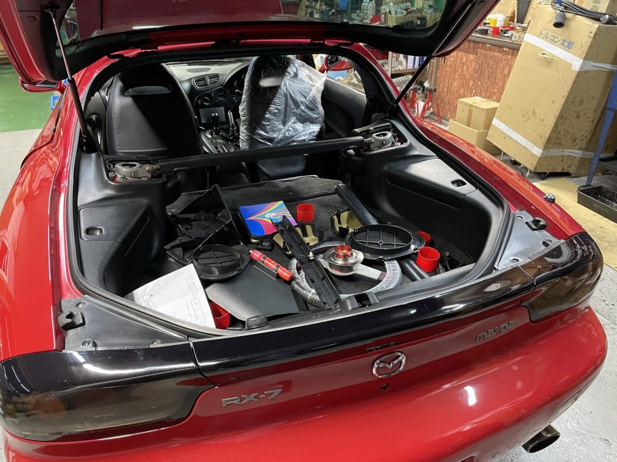 作業中のFD3Sはリアスピーカー交換に移ります。